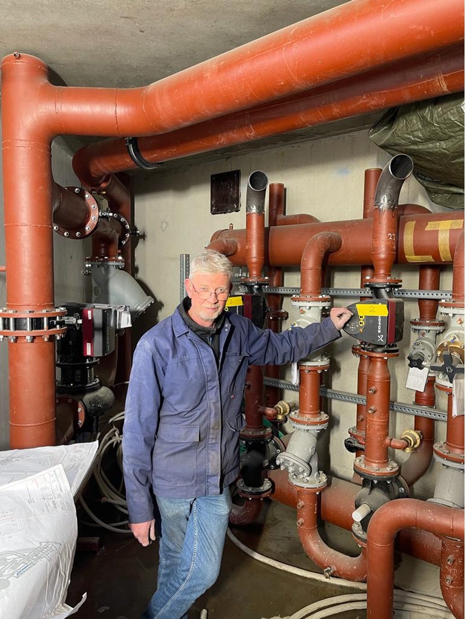 Het is gewichtheffen geblazen in de WKO-ruimte van project Olympiade In Amstelveen. Ondanks de schaal van het project is Richard Holtrigter (montageleider) er wel lekker nuchter onder: “Het is het mooiste werk, dat paswerk. Want goed passen is het met een project van dit formaat. Alles is groot en zwaar, dat betekent opletten wat je doet. Je moet vooraf denken, om het daarna aan te pakken. Je hebt te maken met zware materialen, zoals grote fittingen en kranen. ”Richard werkt samen met Clemens Aaldering (vakmonteur). “We hebben het enorm naar ons zin en maken regelmatig goede grappen. Dan is het maar goed dat we in de kelder zitten. “