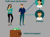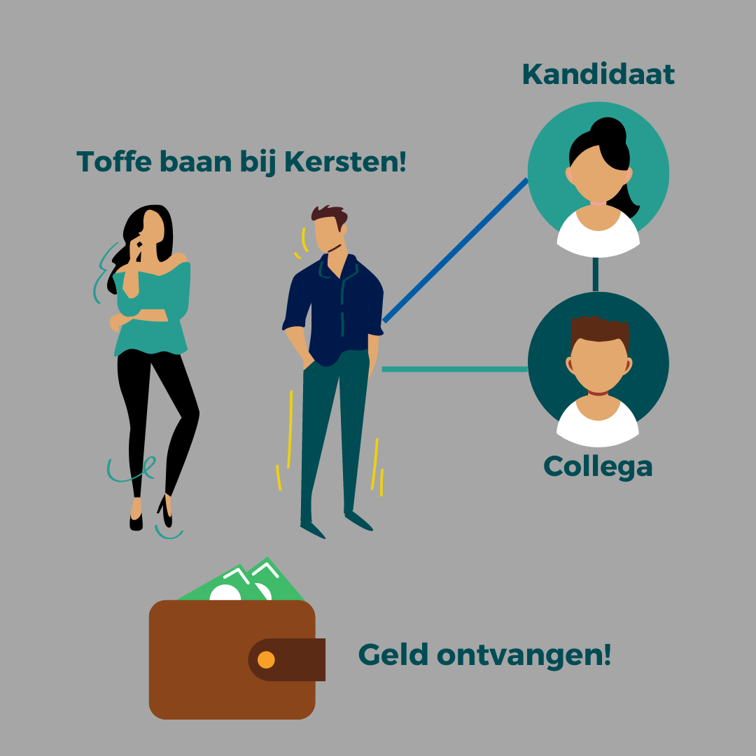 In totaal € 2.500,- netto bonus als je een nieuwe collega aanbrengt; namelijk € 750,- netto als de proeftijd is doorlopen en € 1750,- netto als hij/zij na de eerste contractperiode een contractverlenging krijgt.