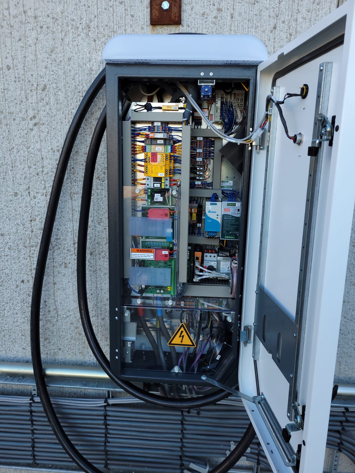 Rick vult aan: “Voor de 6 zwaardere laders was een vrij lang stuk bekabeling nodig. Als we de kabels onder de grond gingen leggen moest het vloeistofdichte wegdek opengemaakt worden. Dat openbreken is best prijzig. We hebben nu 2 goten gemaak op de muur rondom het terrein. Daar gaan de kabels in die naar de achterste laders gaan. De kabelgoten en kabels liggen er nu dus allemaal al. Het is dadelijk nog een kwestie van de laatste 6 laders neerzetten en deze aansluiten.”